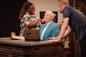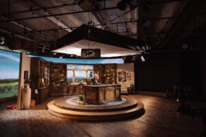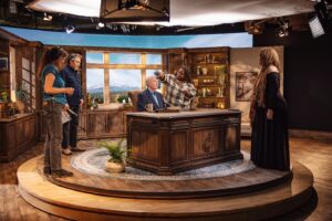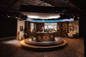Through the Bible is being produced by Betsy Massoth and filmed in Studio C in the IPG (internal parking garage) at Charis. It’s filmed in a beautiful new set that was built in only a week and a half. Although the format of Andrew being 1-on-1 with the camera lends itself to The Gospel Truth daily show, this new show has a look-and-feel that is a little classier, with Andrew wearing a suit jacket and the set having warm tones, plants and decorative objects on the bookshelves, lots of wood elements including a gorgeous new desk, and a lovely Colorado LED background out of the windows. As Elizabeth Muren shares, it is elegant, homey, and fits his personality.